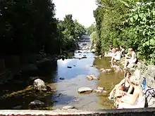 On 28 June 1888 Berlin's city parliament decided for City Garden Director Hermann Mächtig's design for a park on the acquired unbuilt slopes of Kreuzberg, including a waterfall between the monument on top of the Kreuzberg and the Großbeerenstraße.[49] The park was named Victoria Park (Viktoriapark), in honour of Princess Victoria of Great Britain and Ireland, Prussian and German crown princess consort.[52] Mächtig and the sculptor Albert Manthe travelled through the Giant Mountains visiting natural waterfalls to get inspired.[53] Having returned Mächtig himself assisted by a confidant foreman started modelling and constructions for the park.[49] For the waterfall Mächtig used pieces of rock from the Giant Mountains and boulders.[54] The Wolfsschlucht (lit. wolf's gully) was designed into another exploited sand pit east of the hill top.[55] Some built-up parcels on the southern side of Kreuzbergstraße had been bought and the houses there were demolished in order to include their plots into the park. In 1894 the Victoria Park opened.