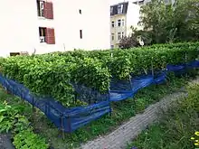 A historic wine-growing area, today the Kreuzberg is covered again by two small vineyards. One was founded in 1968 on the cleared site of Methfesselstraße 10, it is owned by the Borough of Friedrichshain-Kreuzberg, and cultivated by the adjacent market garden.[68] The other, however, lacking authorisation to distribute its harvests as food, established in summer 2006 within the Victoria Quarter on the southern slope of the Kreuzberg.[68] The vineyard on Methfesselstraße provides for the local "Kreuz-Neroberger" wine, gained from vines donated by Kreuzberg's twin towns Wiesbaden (1968) and Ingelheim am Rhein (1975), as well by the Bergstraße county (1971 and 1973) and from Bad Bergzabern (1985).[68] About 600 bottles are pressed every year, not in Berlin, but in wineries in Mainz-Kostheim and Ingelheim.