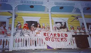 ![]() The "Bearded Oysters" dance troupe on a balcony before the start of the parade |