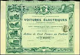 In 1894 Louis Antoine Kriéger (1868–1951) of Paris, France began designing and building electric automobiles. By 1898 when electric powered vehicle interest increased in France, Kriéger organized the Kriéger Company of Electric Vehicles (Société des Voitures Électriques Système Kriéger). The Brougham, The Landaulette and The Electrolette were three of the models produced. In 1901 43 electric vehicles were produced. In 1902 at least 65 were produced. Kriéger produced or assisted in several racing vehicles including one called 'Powerful' in 1900.[1]