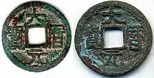 From around the third or fourth century Kucha began the manufacture of Wu Zhu (五銖) cash coins inspired by the diminutive and devalued Wu Zhu's of the post-Han dynasty era in Chinese history. It is very likely that the cash coins produced in Kucha predate the Kaiyuan Tongbao (開元通寳) and that the native production of coins stopped sometime after the year 621 when the Wu Zhu cash coins were discontinued in China proper.[46] The coinage of Kucha includes the "Han Qiu bilingual Wu Zhu coin" (漢龜二體五銖錢, hàn qiū èr tǐ wǔ zhū qián) which has a yet undeciphered text belonging to a language spoken in Kucha.[47][48]