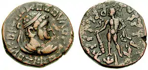 The origins of Kujula Kadphises are quite obscure, and he is usually believed to be a descendant of the Kushan ruler Heraios, or possibly identical with him.[2] However, Kujula shares his name (Kushan: Κοζουλου on some of his "Hermaeus" coins, or Κοζολα on his "Augustus" coins) with some of the last Indo-Scythian rulers, such as Liaka Kusulaka (Greek: Λιακα Κοζουλο), or his son Patika Kusulaka, which might suggest some family connection.[3]