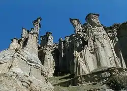 There are hoodoos situated on the İzmir-Ankara state highway D300/E96 near Yurtbaşı village. They are formed when relatively soft rock is topped by harder stone; the softer rock is washed away by atmospheric factors, leaving a capping of the harder material which is more resistant to erosion. The formation process is ongoing, and while some hoodoos fall down, new ones are being formed.[1]