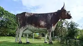 The Big Cow was built in the 1970s to attract tourists to a working dairy farm at 9-11 Ayrshire Rd. It is one of the many Australian Big Things. It was sculpted by Hugh Anderson, who also sculpted the Big Bulls in Rockhampton. The Big Cow is seven times the size of an Ayrshire cow on which it is modelled. It is made of concrete and described as "able to withstand a cyclone". After the dairy farm closed, the Big Cow remained on the property which was used for a variety of purposes. In March 2016, the Big Cow was described as "closed and fallen into disrepair".[5] On 10 January 2020, the Big Cow was moved to the Highfields Pioneer Village complex near Toowoomba, where their volunteers hope to fully restore the Big Cow.[6]