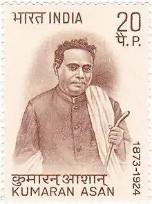 N. Kumaran Asan (12 April 1873 – 16 January 1924) was an Indian social reformer, philosopher and poet of Malayalam literature. He is known to have initiated a revolution in Malayalam poetry in the first quarter of the 20th century, transforming it from the metaphysical to the lyrical and his poetry is characterised by its moral and spiritual content, poetic concentration and dramatic contextualisation. He is one of the modern triumvirate poets of Kerala and a disciple of Sree Narayana Guru.