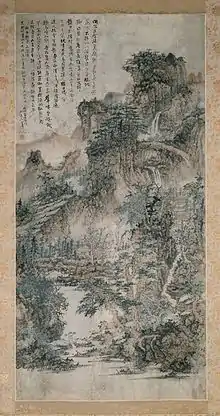 Kun Can (髡殘) (1612 to after 1674) was a Chinese painter from Hunan who spent most of his life in Nanjing. He became a Chan Buddhist monk at an early age and in Nanjing was abbot of a monastery on Niushou Shan. His style of landscape painting was influenced by Wang Meng and he is one of the Four Monk Masters in the early Qing Dynasty. The others being Zhu Da, Hong Ren, and Shitao. As he was also known as Shi Xi he was at times said to be one of the "Two Shi". Few of Kun Can's works survive.