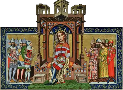 The 14th-century Chronicon Pictum shows Cumans as the king's yellow-clad army, in close proximity to the kings, between the Pecheneg guard and Székely frontiersmen. Cumans are also mentioned as present at the Battle of Kressenbrunn, possibly in larger numbers than their Hungarian allies.[13] Their importance to Hungary was underscored when Béla betrothed his son Stephen to Kuthen's daughter, Elizabeth the Cuman. Her son, King Ladislaus IV, was noted for his unusually strong links with Kunság settlers.[14]