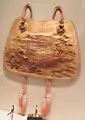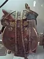 Shita-kura or hadazuke, the twin set of double leather pads attached to the bottom of a Japanese saddle tree (kurabane). The shita-kura (hadazuke) protects the back of the horse from the kurabane.