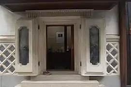 Windows were often situated high up in the kura and were frequently left open to provide ventilation, although there were often iron bar grilles to prevent theft. Windows were often formed in a similar way as doors with a stepped perimeter. When a fire broke out both the doors and the windows were closed and their edges were covered over in plaster.[28]