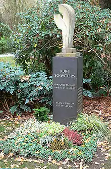 He was buried on 10 January at St. Mary's Church, Ambleside. His grave was unmarked until 1966 when a stone was erected with the inscription Kurt Schwitters – Creator of Merz. The stone remains as a memorial even though his body was disinterred and reburied in the Engesohde Cemetery in Hanover in 1970, the grave being marked with a marble copy of his 1929 sculpture Die Herbstzeitlose.