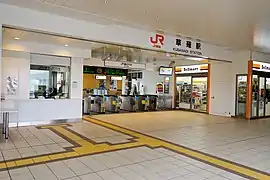 The station has two opposing side platforms serving Track 1 and Track 2, with headshunts, allowing for tracks for express trains to pass in between, and a footbridge connecting the platforms. The station building has automated ticket machines, TOICA automated turnstiles and a staffed ticket office.