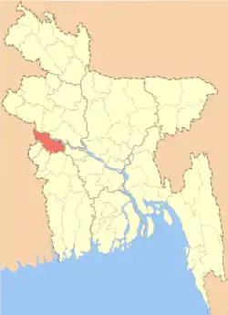 Kushtia (Bengali: কুষ্টিয়া জেলা, pronunciation: kuʃʈia) is a district in the Khulna administrative division of western Bangladesh. Kushtia has existed as a separate district since the partition of India.[4] Prior to that, Kushtia was a part of Nadia District under Bengal Province of British India. Kushtia is the birthplace of many historical figures including Mir Mosharraf Hossain (1847–1912),[5] Bagha Jatin (1879–1915)[6] and Lalon Fakir (1774–1890).[7] Nobel laureate poet Rabindranath Tagore lived his early life at Shelaidaha.[8]