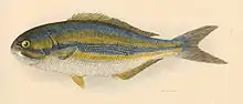Kyphosus ocyurus has an elongated, compressed, oval shaped body.[1] The ventral and dorsal profiles of the head are convex with a short snout and a very short, horizontal mouth which opens at the front. The upper jaw is partially concealed beneath the orbital bones when the mouth is closed and the teeth are small, fixed and are incisor-like with flattened tips. There are also teeth in the middle of the roof of the mouth. It has a continuous dorsal fin which has 11 spines in the anterior part which fold down into a scaled groove and 13 soft rays in the posterior part. The anal fin has three spines and 14 soft rays and is low. The caudal fin deeply forked. All of the body is covered in small, thick and rough scales except for the snout.[2] The body of this species is distinctively coloured with two wavy horizontal stripes, one yellow and one bluish, starting at the mouth and extending to the caudal peduncle. The head is yellow to silvery marked with a blue streak behind eye on he dill cover. It is metallic blue on the back and white on the underparts. It attains a maximum total length of 59 centimetres (23 in) although a more common size is a total length of 25 centimetres (9.8 in) and the maximum published weight is 2.0 kilograms (4.4 lb).[1]