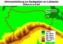 The highest hills in Lübbecke's territory are the Heidbrink (320 m), the Wurzelbrink (319 m) and the Kniebrink (315 m). Next to the town itself is the Reineberg (276 m), the Heidkopf (273 m) and the Meesenkopf (226 m). The hills in the south of the borough are the highest in the whole of the Wiehen ridge. In the north the land only attains a height of about 50 m. The lowest point is about 48 m.