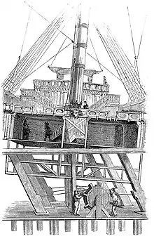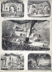 The stage designs for the original production at the Paris Opera were created by Auguste Alfred Rubé and Philippe Chaperon for Act 1 (Council Scene) and Act 2 (Dungeon Scene); Charles-Antoine Cambon and Joseph Thierry for Act 3 (Sea Scene and Shipwreck) and Act 4 (Hindu Temple); Jean-Baptiste Lavastre for scene 1 of Act 5 (Queen's Garden, not shown); and Edouard Desplechin for scene 2 of Act 5 (The Manchineel Tree). Engravings depicting the amazing sets appeared in periodicals throughout Europe. The final scene designed by Desplechin received special praise for its originality. Possibly because of advance publicity and high expectations, the Shipwreck Scene of act 3, executed by numerous stagehands, was deemed by the press to be somewhat disappointing. However, Arthur Pougin writing in 1885 identified the scene as the epitome of the company's grand opera mise en scène.[28]