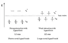 Many transition metal complexes with electronic configuration d4-d7 are capable of spin crossover (and d8 when molecular symmetry is lower than Oh).[2] Spin crossover refers to where a transition from the high spin (HS) state to the low spin (LS) state or vice versa occurs. Alternatives to LIESST include using thermal changes and pressure to induce spin crossover. The metal most commonly exhibiting spin crossover is iron, with the first known example, an iron(III) tris(dithiocarbamato) complex, reported by Cambi [3] et al. in 1931.