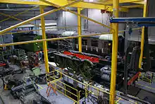 The first full livery is LNER-style express passenger apple green, with "British Railways" on the tender, as worn by the original locomotives in 1948.[14][16] The first 30 Peppercorn A1s delivered wore this colour.[19] This was applied by the NRM paint shop after completion of mainline trials at the NRM in York.[20] Painting was behind closed doors, with the finished article unveiled (without nameplates) on 13 December 2008, in front of 500 supporters of the A1 Trust.[19] The green livery was applied in the traditional way, brush painted by hand.[11] Tornado was unveiled on the turntable with the NRM North Eastern Railway (NER) dynamometer car.[21] Due to time constraints, detailing had been completed only on one side of the locomotive at the launch, and Tornado re-entered the paintshop after the launch before going back on display.[21]