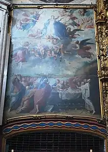 The choirs of the church located on either side of the main altar. This was not the usual place for the choir; normally one choir would be placed above what is the entrance to the church. Since both are in the front of the church, lattice-work screens were placed to shield the nuns from the gaze of commoners during services. Above these choirs, enormous paintings depicting the Assumption of Mary and the Immaculate Conception were installed.[8]