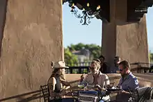 La Plazuela is a full-service restaurant serving inspired New Mexican cuisine, while the La Fiesta Lounge, a bar and restaurant, serves lunch and dinner. La Fiesta has live music and a dance floor.[9] On the roof of the fifth floor is the Bell Tower Bar.[10] On the street level is the eclectic gift shop, Detours at La Fonda and as well as many other shops, including the independently-owned French Pastry Shop and Restaurant, which serves breakfast and lunch.[11]
