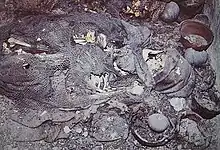 Another item found tucked in with two of the bodies was barkcloth, a versatile material made from the bark of certain trees. The male corpse was widely covered in dark brown strips of barkcloth about 3–4 cm wide, which were inside the strings but outside of the hair tufts, whilst one of the two women also had similar strips, but less than the man.[11] Grieder suspected that the inclusion of this material was because those burying the dead thought that bark cloth had "spiritual power",[11] a widespread belief that was found across the Pre-Columbian Americas.[12]