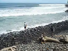 The main break extends from La Punta to the township, a distance of about 800m, although single rides do not normally connect the sections through the whole distance. There are three main sections: the top of the point is a hollow and fast wave called "La Punta". The middle section is in front of the cemetery. The inside cove, fronting the town's restaurants, is called "La Paz"; this section is good for longboarding. On a good day, when the swell is 6 to 8 feet high (Hawaiian scale), the upper part of the point produces the best waves, allowing a ride of about 300m or more. It is relatively easy to "drop in" on the long, fast, and powerful walls, which turn into hollow barrels on the best days. The main takeoff is close to a dangerous rock which often sticks out of the water, and has caused injuries. Surfing is good on all tides, although low tide probably produces more barreled waves. The wave form of this break is unusual in that it often breaks at a slight angle to the shoreline, hitting it slightly squarely, creating powerful and fast walls. It can be difficult to get outside in large swells, and the rocky shoreline is notorious for its difficult entry.