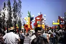 La Ronde was the entertainment complex built for Expo 67, the world fair held in Montreal from April 27 to October 29, 1967.[1] The exposition was located on 400 hectares (990 acres) (ha) of man-made islands in the St Lawrence River adjacent to Montréal, and comprised six "theme" pavilions, 48 national pavilions, four provincial pavilions, 27 private-industry and institutional pavilions, and La Ronde – a 54 ha (130 acres) entertainment complex with theatres, midway attractions, drinking and dining.[3] Visitors could experience the rides, restaurants and beer halls of La Ronde until 2:30 a.m. nightly. The rest of the Expo site closed down at 10:30 p.m.[4] After Expo 67 World's Fair, the City of Montreal continued to run the amusement park for the next 34 years.[5]