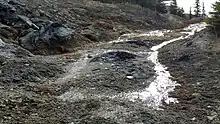 La Saline Natural Area lies in the heart of the Athabasca Oil Sands region. The spring water at La Saline originates primarily from the Devonian strata that underlie the region, including the carbonate rocks of the Keg River and Waterways Formations, and the halite (rock salt) deposits of the Prairie Evaporite Formation.[3] As the water travels through those formations it becomes enriched in dissolved carbonate and evaporite minerals. The spring water at La Saline has a reported total dissolved solids content of 71,400 milligrams per litre (0.00258 lb/cu in)[4] and it comes to the surface because it has reached an aquitard formed by the bitumen-saturated sands at the base of the overlying Early Cretaceous McMurray Formation. As carbon dioxide and small amounts of hydrogen sulfide gas are released to the atmosphere, some of the dissolved minerals precipitate, forming the tufa.[1] Analysis of the tufa has shown that it includes calcite, dolomite, quartz, gypsum, anhydrite, barite, and elemental sulfur.[4] Tufa deposits, including a large mound measuring 3 m (9.8 ft) in width, have accumulated around the salt springs on the lake's southeastern shore.[1]