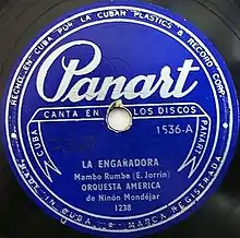 Between 1953 and 1954 it is estimated that Panart sold 13,000 copies of the single, something completely unprecedented for Cuba's first independent record label.[8] On June 30, 1953 a cover was recorded by singer Miguelito Valdés backed by pianist René Hernández's conjunto, and billed by Seeco as a ritmo de cha cha chá.[9][10] The name "cha-cha-chá" actually came from the refrain of its original B-side, "Silver Star", which also became a hit.[3] In the original Panart issue, "La engañadora" is billed as a "mambo-rumba" and "Silver Star" as a danzón. Miguelito Valdés' cover was followed by many other versions recorded in Cuba, Mexico and the US, by artists such as René Touzet, Tito Rodríguez and Pérez Prado, establishing the song as a Cuban standard.