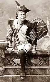 After immense success in the 1860s, Offenbach suffered a brief period of unpopularity with the Parisian public in the early 1870s for his association with the fallen Second Empire. His position as the pre-emininent composer of operetta was threatened by the rise of Charles Lecocq,[1] but by the later years of the 1870s he had recovered his popularity. Madame Favart (1878) had run for more than 200 performances at the Théâtre des Folies-Dramatiques:[2] a run of half that length was reckoned a success in the Parisian theatres of the time.[3] The writers Alfred Duru and Henri Chivot were established authors of librettos for comic operas, having collaborated with Lecocq, Léon Vasseur, Edmond Audran and, in 1868, Offenbach (L'île de Tulipatan). To follow Madame Favart the three wrote La fille du tambour-major for the Folies-Dramatiques and its company, which starred Parisian favourites including Juliette Simon-Girard, Caroline Girard and Simon-Max.[4] The story of the new work was regarded as a variation on Gaetano Donizetti's La fille du régiment (1840). In the earlier work the heroine, who has been brought up by an army regiment, is in reality, the daughter of a marchioness; in Duru and Chivot's version, the heroine's mother is a duchesse, and her father is drum major of an army demi-brigade.[4]