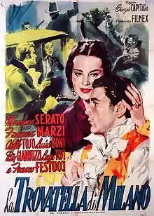 La trovatella di Milano (i.e. "The foundling of Milan") is a 1956 Italian historical melodrama film produced and directed by Giorgio Capitani and starring Massimo Serato and Franca Marzi. Set during the Five Days of Milan, it is loosely based on a novel with the same name written by Carolina Invernizio.[1][2] It grossed 146 million lire at the Italian box office.[1]