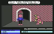 The player's goal is to locate and destroy Jareth within 13 real-time hours; otherwise, the protagonist will be trapped in the maze forever.[6][7] While traveling the maze, the player passes through a series of scrolling hallways that contain doors, enemies and other things.[6] A "radar" bar on the screen allows the player to see each hallway in miniature form: the locations of all doorways, items and characters in a given hallway are displayed.[6][8] Unlike other adventure games of the period, Labyrinth does not feature a command-line interface. Instead of typing commands, the player selects them from two scrolling "word wheels", one for verbs and one for nouns.[1][5][9] For example, the verb "congratulate" may be selected in one wheel, and the noun "Jareth" in the other: this inputs the command "congratulate Jareth".[1] Based on the player's items and location, the available verbs and nouns change context-sensitively.[5]