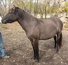 The Lac La Croix pony is a small riding horse standing 122 to 147 centimetres (12.0 to 14.2 hands; 48 to 58 in) high.[1] The breed is seen in any solid color except white and cream dilutions. Black and bay are common, as are dun shades with primitive markings. They are hardy, with smooth-flowing gaits,[2] and a reputation for being gentle and intelligent. It is considered the only breed matured by indigenous people in Canada.[3]