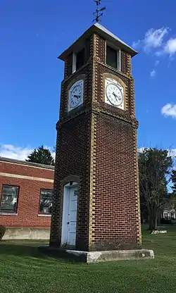 ![]() The Laocna Clock Tower with the side of the First National Bank of Lacona in the background. | |