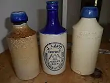 As with their competitors, Ladds used many kinds of bottles over the years, including various "stonie" pottery bottles, and in glass the Codd pattern (with the internal glass ball seal), Barrett or Riley pattern (with a Vulcanite "screw-top" threaded stopper)[7] in the 26 imperial fluid ounces (740 ml) bottle and, from around 1930, crown seal types. Bottles remained the property of the drink manufacturer, and if undamaged could be steam-cleaned and re-used over and over again. Mrs. Ladd purchased second-hand bottles from dealers ("marine store collectors") and instructed her bottle-washers and fillers to use all bottles, no matter what the brand. This was against the rules of the Aerated Waters and Cordial Makers' Employés' Union, (It was some 20 years before the manufacturers had a similar agreement)[8] and the men refused to do so, and threatened strike action if forced to disobey Union Rules. Mrs. Ladd's motives were financial: she purchased secondhand bottles for 8d. per dozen, whereas new bottles cost 36s. per gross (3s. per dozen).[9] In today's money that would be around $5.00 v. $22.00 per dozen.[10]