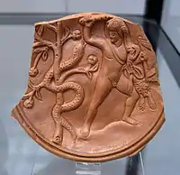 The image of the dragon (Ladon) coiled round the tree, originally adopted by the Hellenes from Near Eastern and Minoan sources, is familiar from surviving Greek vase-painting. In the 2nd century CE, Pausanias saw among the treasuries at Olympia an archaic cult image in cedar-wood of Heracles and the apple-tree of the Hesperides with the dragon coiled around it.[5]