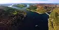 ![]() Ladybower Reservoir from Bamford Edge (seen in the foreground); the wall can be seen in the bottom left and the Ashopton Viaduct in the top centre | |