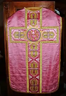 In Roman Catholic, Anglican, Lutheran and Old Catholic churches flowers may appear on the high altar and the organ may be played as a solo instrument. Priests are given the option to wear rose-colored vestments at Mass held on this day in place of the violet vestments normally worn during Lent.[5] The term "rose" is used to describe this lighter shade of the color violet in the Roman Rite.[6]