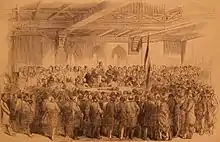 From Britain Kossuth went to the United States of America. In early 1852, Kossuth, accompanied by his wife, Ferenc and Theresa Pulszky, toured the American Midwest, South, and New England. Kossuth was the second foreigner after the Marquis de Lafayette to address a Joint Meeting of the United States Congress.[50] He gave a speech before the Ohio State Legislature in February 1852 that probably influenced Lincoln by his Gettysburg Address: "The spirit of our age is Democracy. All for the people, and all by the people. Nothing about the people without the people - That is Democracy! […]"[51] On 6 December 1851, this revolutionary hero arrived in New York to a reception that only Washington and Lafayette had received before.
