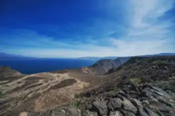 The main source of supply, however, is subsurface geothermal springs with aquifers linked to the sea water from the Ghoubbet El Kharab bay, which is 10 km (6.2 mi) to the southeast of the lake. The bay is part of the Gulf of Tadjoura, a western extension of the Gulf of Aden. The subterranean flow from the Gulf of Ghoubbet of the Red Sea is through a fissured channel of 5 km (3.1 mi) length by gravity in basalt formations of mountains existing on the east side of Lake Assal, as spring. The spring that emerges into the lake has a salt content of 39 g/L which is close to that of seawater. The lake water fluctuates by about 1.5 m (4.9 ft) with subsurface inflow estimated at 5,000–8,000 litres per second.[5][6] The seawater-derived geothermal aquifer of the Asal-Fiale area is located in an exposed and actively extending continental rift that will become an arm of the Red Sea. In particular, Lake Assal is eligible as an experimental site to study the evolution of the deep hot brines of the Red Sea.[15] Indeed, by observing the strontium composition of the Red Sea brines, it is easy to deduce how these salt waters found at the bottom of the Red Sea could have evolved in a similar way to Lake Assal, which ideally represents their compositional extreme.[15]
