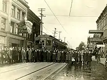 The railway's early rolling stock consisted of four 58-foot-long (18 m) passenger coaches, constructed of wood and steel, which were numbered 225, 235, 245, and 255; two control trailers numbered 265 and 275; two electric freight locomotives numbered 50 and 60; and two combination express/passenger cars numbered 209 and 219.[5] Despite this limited stock, trains were running every two hours.[1]