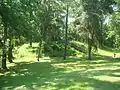 The layout and arrangement of the mounds in the central area of the site suggests that there may have been two large plaza areas. Mounds 2, 3, 4, and 5 form a large rectangular shape that was mostly free of debris. Mounds 2, 3, 6, and 7 also form a rectangular shape that suggests it too was a plaza. Both plazas would have had Butler's Mill Creek (a small stream that once bisected these areas, but whose course was altered in historic times) running through it. Excavations have shown that a clean area between Mounds 2 and 4 was a plaza, but not enough work has been done at the rest of the site to confirm the larger dimension suggested by the first arrangement or the existence of a plaza at the second arrangement at all.[2]