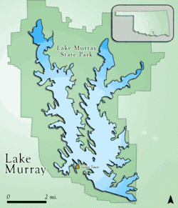Lake Murray is a 5,700-acre (23 km2) lake in south central Oklahoma, near Ardmore named for Oklahoma Governor William H. Murray.[1] It was created by damming Anadarche and Fourche Maline Creeks.[2] The lake is wholly within Lake Murray State Park, Oklahoma's largest state park, containing over 12,500 acres (51 km²) of relative wilderness. A state-operated lodge and resort is located on the west shore that serves many visitors to the lake, and serves as a base for numerous cabin and campground facilities near the lake.[3]