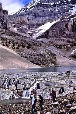 The lake gets its name from a Stoney language (Native American language) term for 'corner'.[3] It can be reached via a 3.2 kilometres (2.0 mi) climbing trail which starts at Lake O'Hara and ascends approximately 250 metres (820 ft).[4][5] An alpine trail along the Yukness Ledges connects Lake Oesa to nearby Opabin Lake.[6]