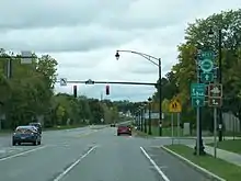 The parkway winds its way southeastward, passing by homes to the south and marshlands surrounding Beatty Point to the north. At the eastern edge of the marsh, the Lake Ontario Parkway meets the northern end of the limited-access NY 390. From here eastward, the parkway travels through highly populated areas of the town, meeting Dewey Avenue, Greenleaf Road, and Latta Road and passing under the Hojack Line. East of Latta Road, it passes into the city of Rochester and its Charlotte neighborhood, where it terminates just 0.25 miles (0.40 km) later at an intersection with Lake Avenue.[7] The right-of-way of the parkway and the Seaway Trail both continue eastward as Pattonwood Drive, which leads to the Colonel Patrick O'Rorke Memorial Bridge a short distance to the east.[7][8] Two blocks north of the junction is the National Register of Historic Places-listed Charlotte–Genesee Lighthouse, located off Lake Avenue.[7]