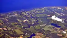The Lake Ontario State Parkway begins at an interchange with Lakeside Beach Road in Lakeside Beach State Park, located within the town of Carlton in north-central Orleans County.[7] It heads eastward as part of the Seaway Trail, which enters the area from the west on NY 18 and turns north onto Lakeside Beach Road to access the parkway.[8] The four-lane limited-access highway exits the park and enters an area dominated by open, cultivated fields, where it skirts the southern edge of Oak Orchard State Marine Park, a small park situated at the mouth of the Oak Orchard River. Not far to the east, the parkway crosses the river itself and connects to the northern terminus of NY 98 by way of an interchange.[7]