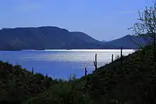 Indian Mesa at Lake Pleasant Regional Park in Arizona. On top of the Mesa are the ruins of a village built by the Hohokam Puebloans about 1000 years ago.[5]