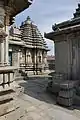 The mantapa is open and square. The reason for the square plan is the presence of shrines on all four sides of the mantapa with no side open for "staggering".[8] There is a separate fifth shrine of Bhairava, an avatar of the Hindu god Shiva. The shrine is complete with its own vimana and tower with a kalasa on top, a sukanasi with a Hoysala emblem on it. Another unusual feature of the temple is the existence of four more minor shrines at each corner of the temple complex with two sides of each shrine attached to the courtyard wall. Each of these minor shrines has its own tower, kalasa and Hoysala emblem.[9] In all, the temple complex has nine towers which is unusual for a Hoysala temple.