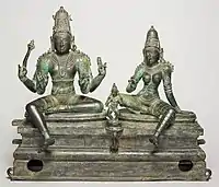 The pose is common for Brahma,[16] Vishnu, Shiva and their consorts, from around the Gupta period onwards. Also the Matrikas, who are typically identified by their different animal supporters, and numerous other figures. As a distinctive regional feature, temples in Odisha in the classic Kaḷinga architectural style very often have a figure of Gajalaxmi in lalitasana as their lalatabimba or central protective image over the doorway to a temple or the sanctuary of one.[17]