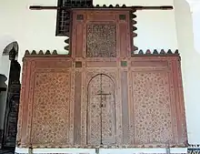 The maqsura is a wooden screen which surrounded an area near the mihrab where the sultan and his immediate entourage prayed. It served to separate the sultan from the rest of the public and to protect him during prayers. The maqsura was installed in the mosque in 1677 (1088 AH) by order of Sultan Moulay Isma'il.[2] Today, only the main central section of the maqsura has been preserved and is on display at the Dar Jamai Museum. It measures 3.55 meters wide and 3.15 meters tall.[2] At its center is a small set of doors within a Moorish archway, and above this is rectangular panel with a Square Kufic inscription composed of a Qur'anic verse (75th verse of Surah al-Hajj) and a statement noting the year of the maqsura's completion.[2]