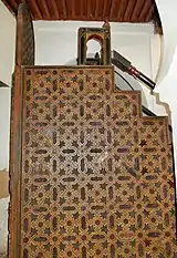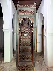 The original minbar of the first Marinid mosque is lost, but when Moulay Isma'il rebuilt or expanded the mosque in the late 17th century he commissioned a new minbar.[2] The minbar, now preserved in the Dar Jamai Museum, is 3.25 metres long and 2.57 metres high and has eight steps.[2] Its overall form and decoration is consistent with the traditional minbars of Moroccan mosques since the 12th-century Almoravid Minbar of the Kutubiyya Mosque and the Almohad minbars after it.[10][11] Much of the minbar is decorated with an eight-pointed star motif, with the main flanks covered in a more elaborate motif found in the earlier minbars. The various polygonal shapes within this motif are inlaid with arabesque-sculpted panels.[2]